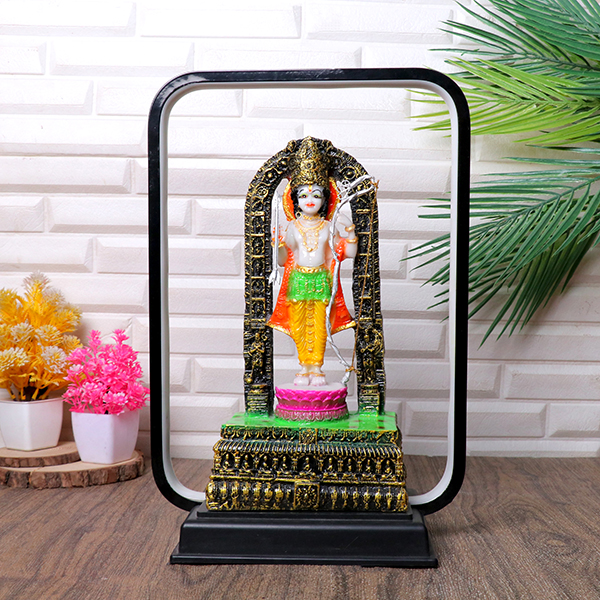 • This exquisite showpiece combines traditional artistry with modern technology, featuring a beautifully crafted Ayodhya Ram Lalla idol set within a vibrant LED frame.